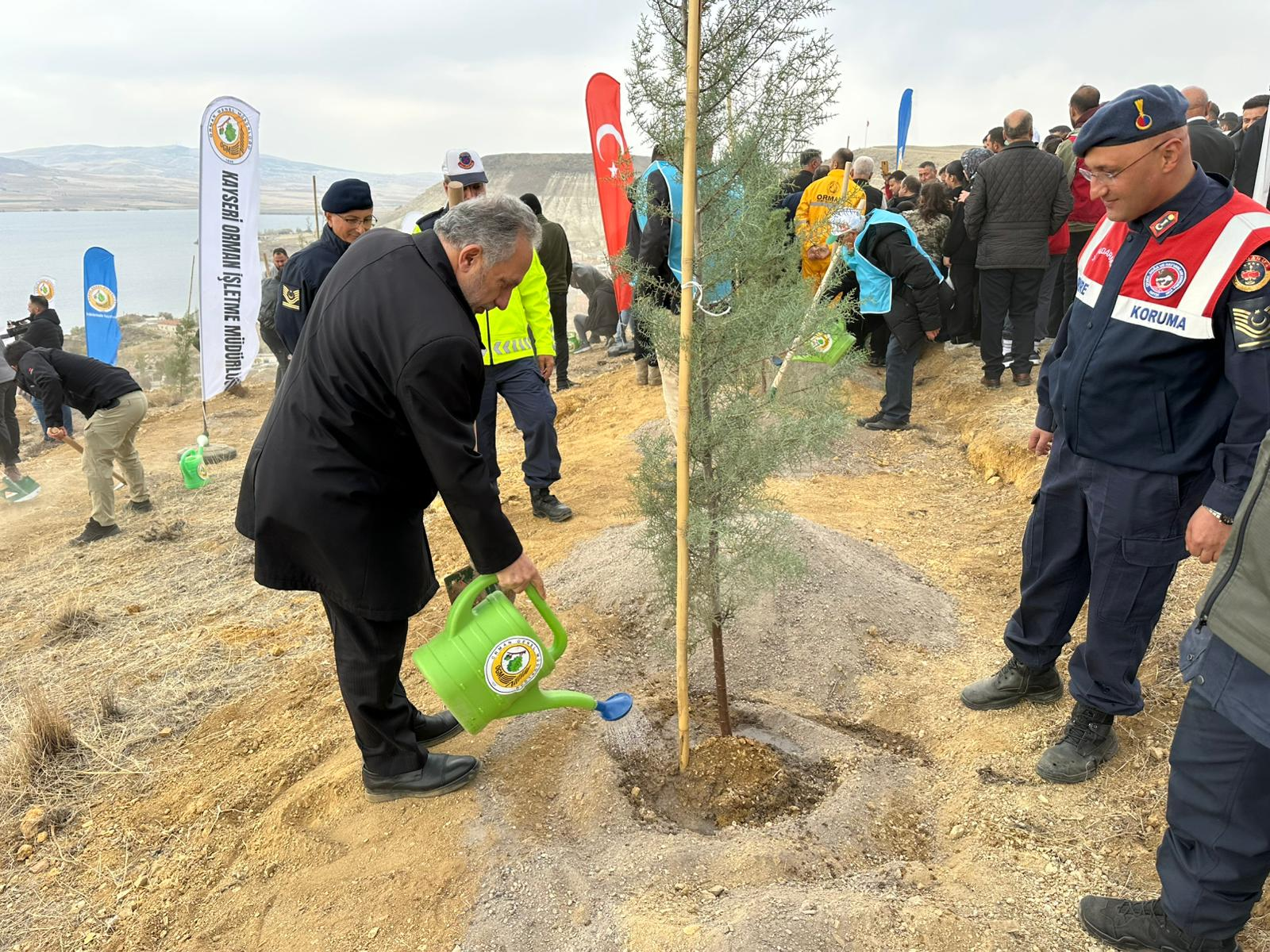 daha önce oluşturulan çukurlara fidanlar yerleştirildi. Daha sonra üzerine